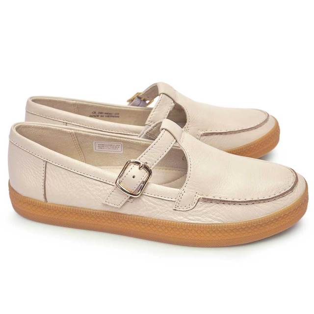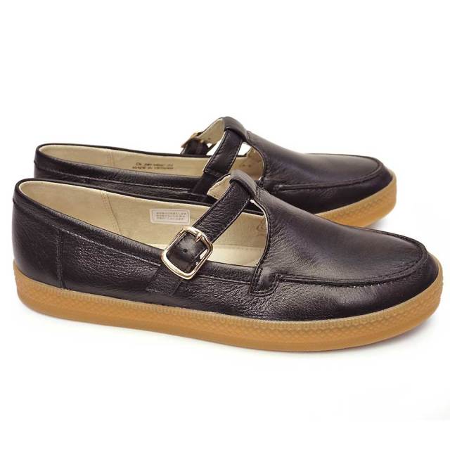 革ならではの高級感と、あめ色の靴底が持つカジュアル感がマッチした軽やかなTストラップシューズ。