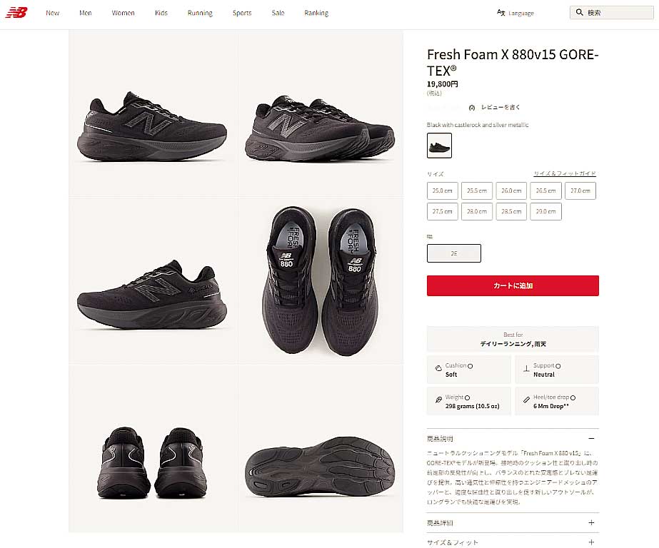 ニュートラルクッショニングモデル「Fresh Foam X 880 v15」に、GORE-TEX(R)モデルが新登場。接地時のクッション性と蹴り出し時の前足部の反発性が向上し、バランスのとれた安定感とブレない足運びを提供。高い通気性と伸縮性を持つエンジニアードメッシュのアッパーと、適度な屈曲性と蹴り出しを促す新しいアウトソールが、ロングランでも快適な足運びを実現。幅、サイズ感・・2E表示