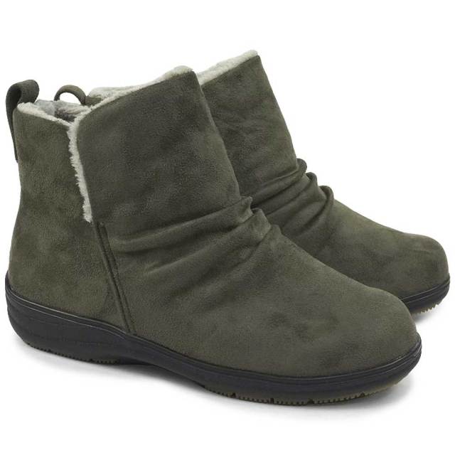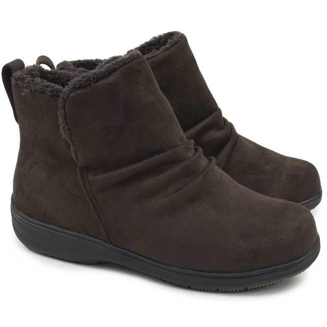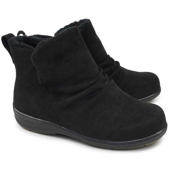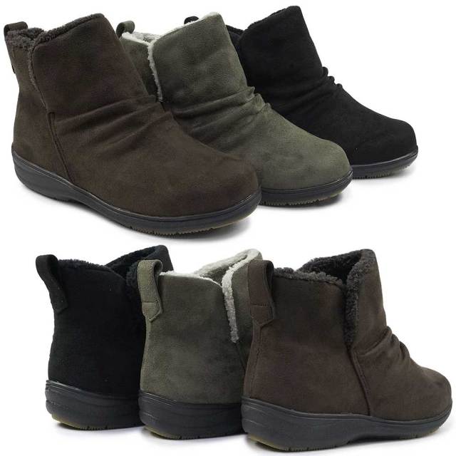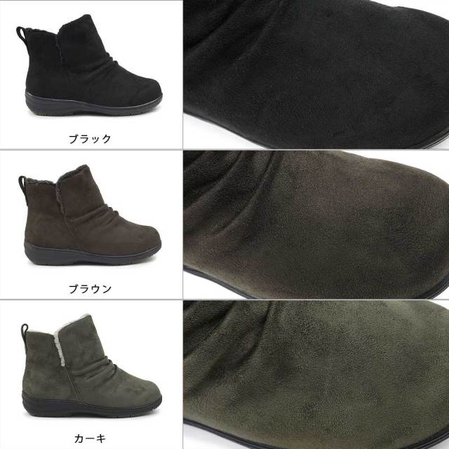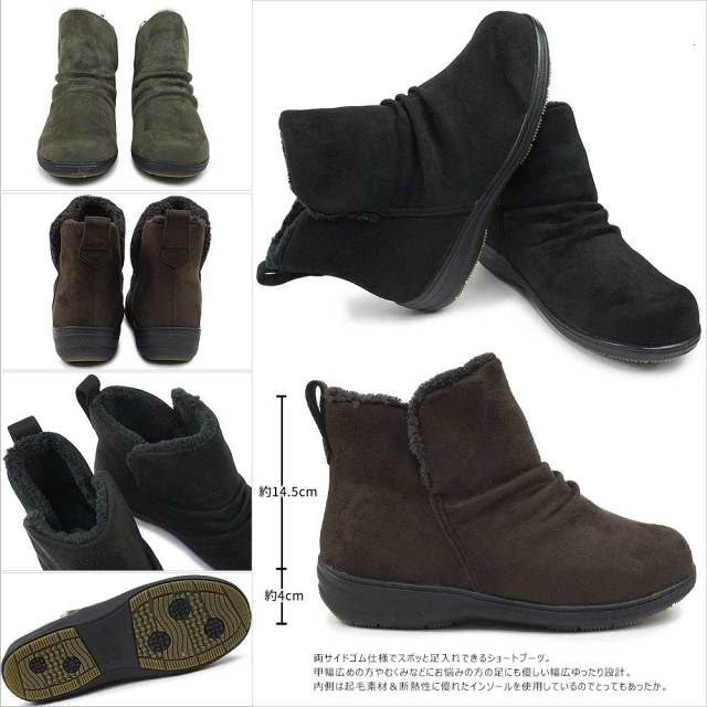甲幅広めの方やむくみなどにお悩みの方の足にも優しい幅広ゆったり設計。両サイドゴム仕様でスポッと足入れできるショートブーツ。内側は起毛素材&断熱性に優れたインソールを使用しているのでとってもあったか。雨や水の浸入を防ぐ生活防水設計。