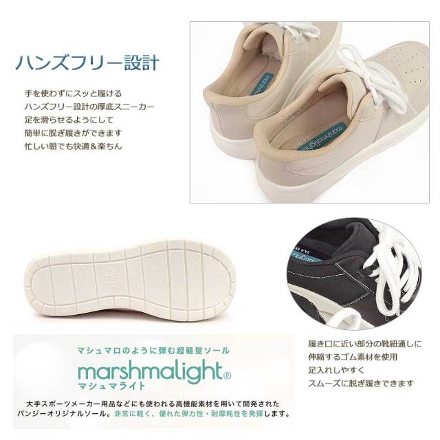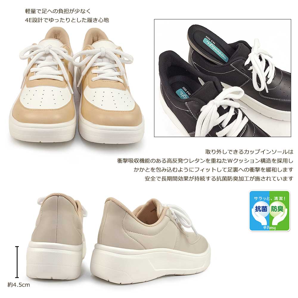 ハンズフリーで簡単に履ける、4E設計でゆったりした履き心地の軽量厚底スニーカー。取り外しできるカップインソールは