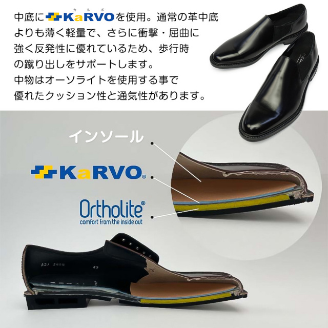 ベーシックな正統派ドレスラストと機能素材『KaRVO(カルボ)』と『オーソライト』を組み合わせた ハイブリッドドレスシューズ。中底には、軽量でバネの役割をする新素材『KaRVO(カルボ)』を採用。 歩行のパワーアシストをし、自らは蹴り出しを促し跳ねるような感覚があります。