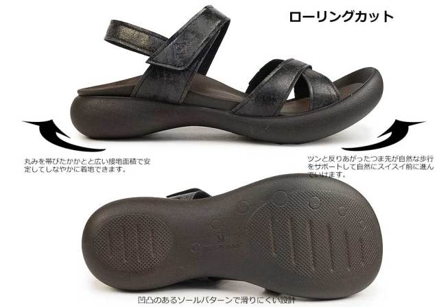 ダメージ加工を施した柔らかいアッパーを使用し、シンプルなデザインで合わせやすく、クロスベルトがつま先を綺麗に見せてくれます。柔らかいインソールが足にやさしく、衝撃を吸収してくれるので、長時間歩いても疲れにくいです。