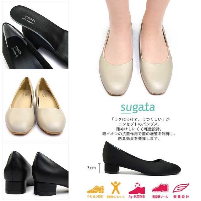 「ラクに歩けて、うつくしい」がコンセプトのパンプス「sugata」シリーズです。屈曲性の良いボロネーゼ製法を採用しています。