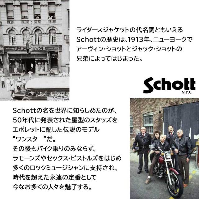 ライダースジャケットの代名詞ともいえるSchottの歴史は、1913年、ニューヨークでショット兄弟によってはじまった。Schottの名を世界に知らしめたのが、50年代に発表された星型のスタッズをエポレットに配した伝説のモデル「ワンスター」。