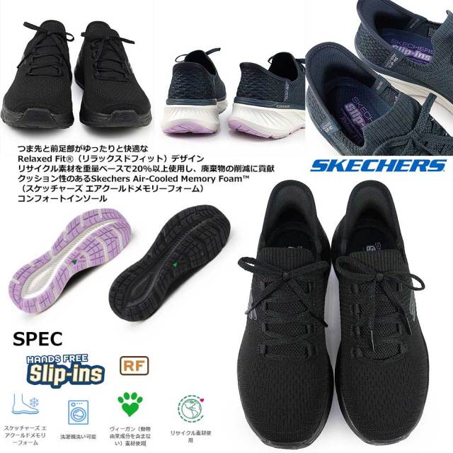 立ったままハンズフリーで靴の脱ぎ履きが可能なSLIP-INS(スリップインズ)モデル。リサイクル素材を使用したデザインの、アスレチックスタイルのヴィーガン(動物由来成分を含まない)シューズ。固定式のストレッチレースを配したストレッチニットのアッパー、クッション性に優れたミッドソール、エアクールドメモリーフォームのインソールが特長です。