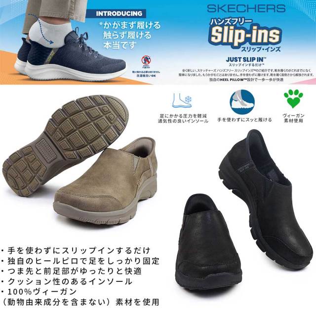 履きやすいスタイルと快適な履き心地が際立つ、スケッチャーズ ハンズフリー スリップインズ。ヒールピローデザインを採用したカジュアルなヴィーガン(動物由来成分を含まない)素材のスリップオンシューズ。