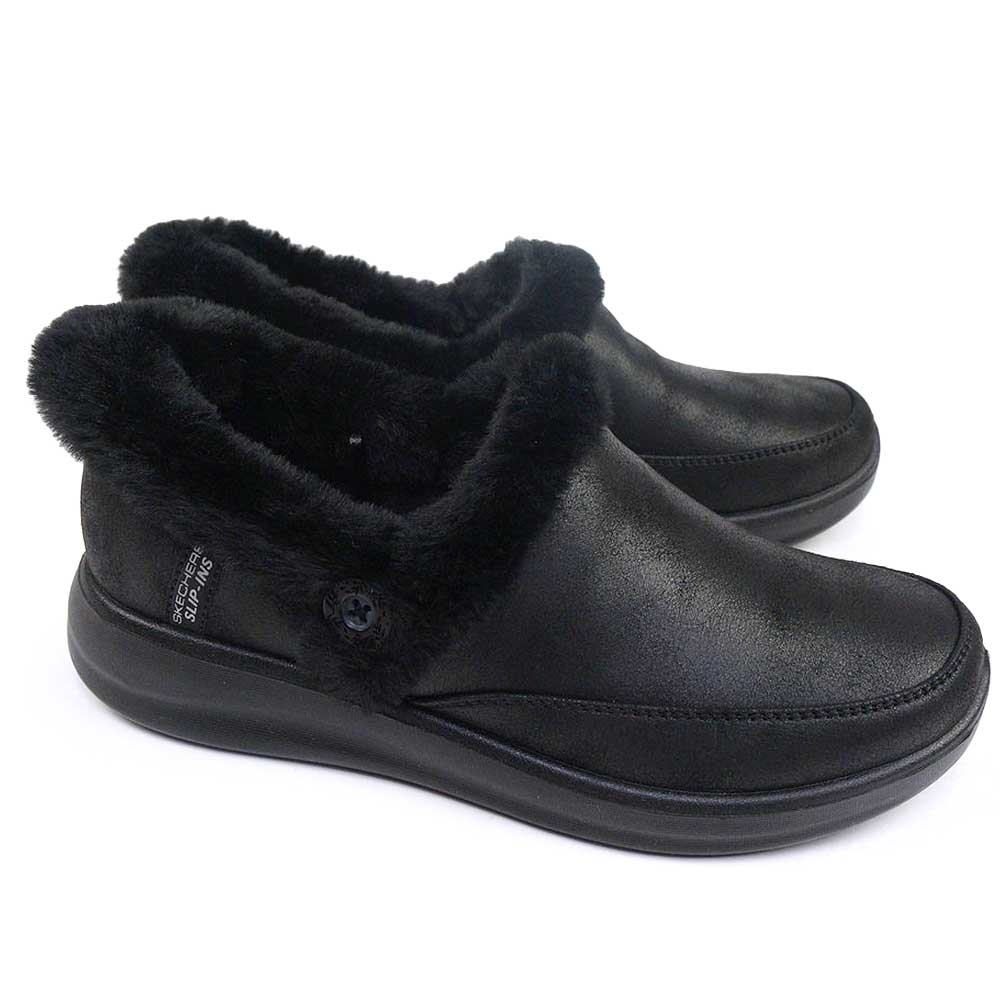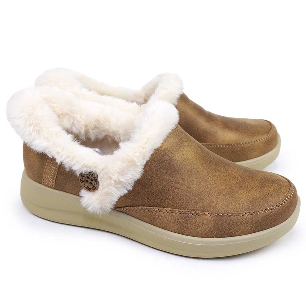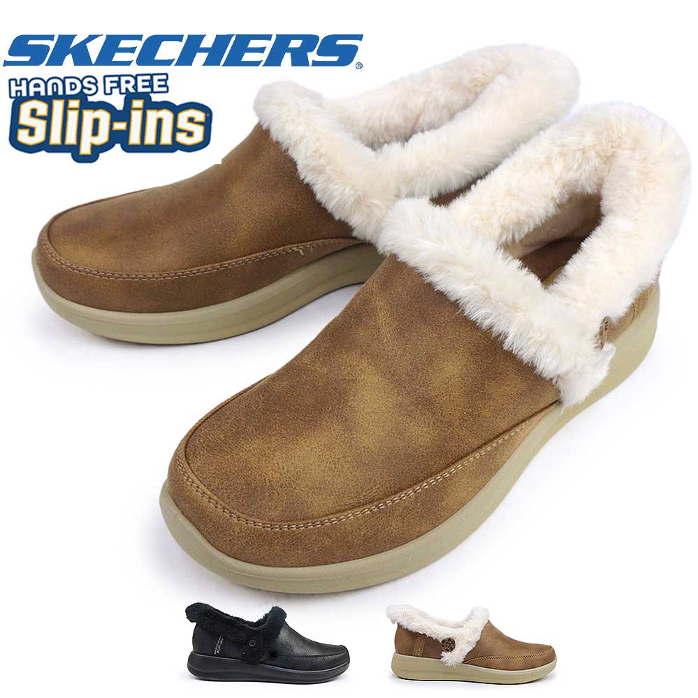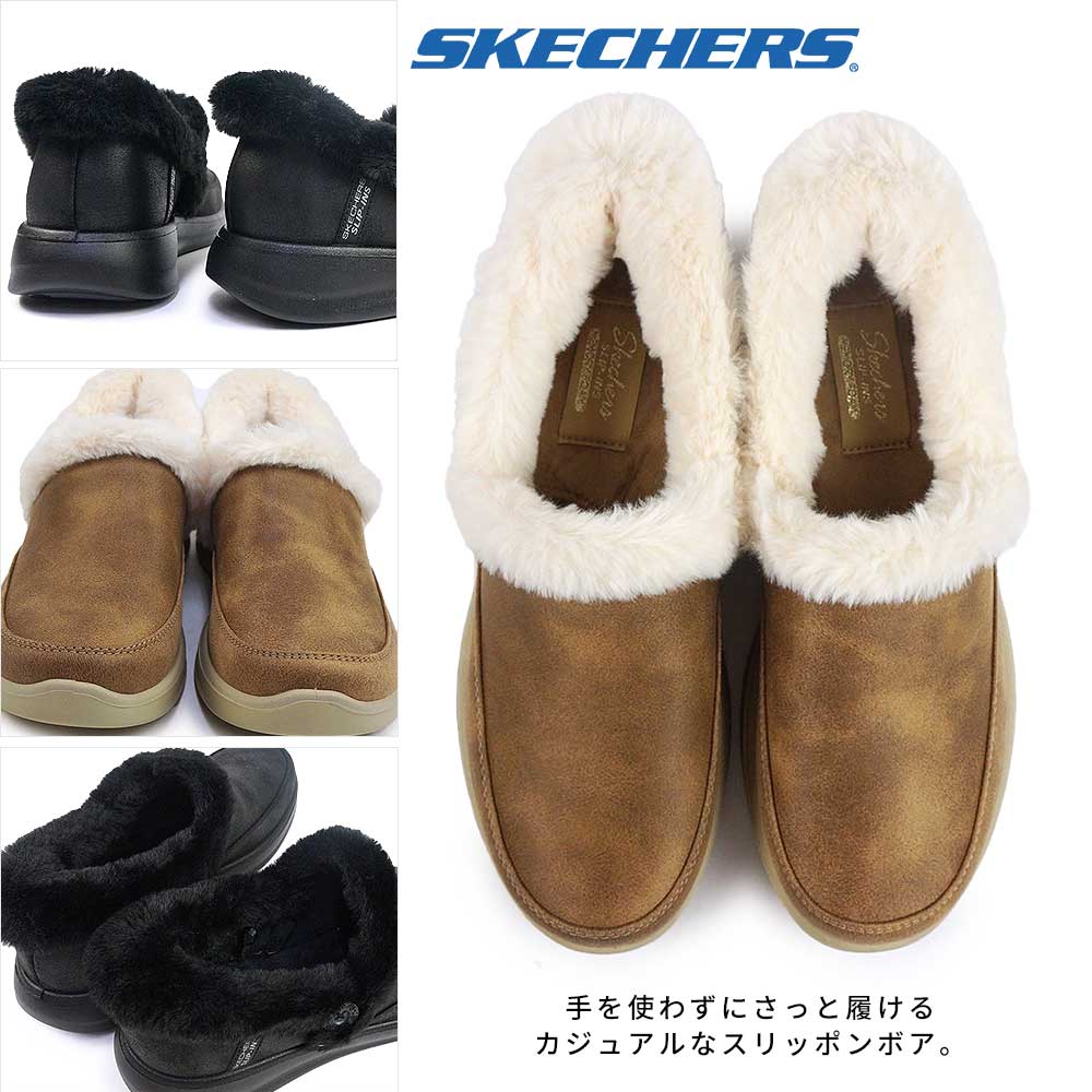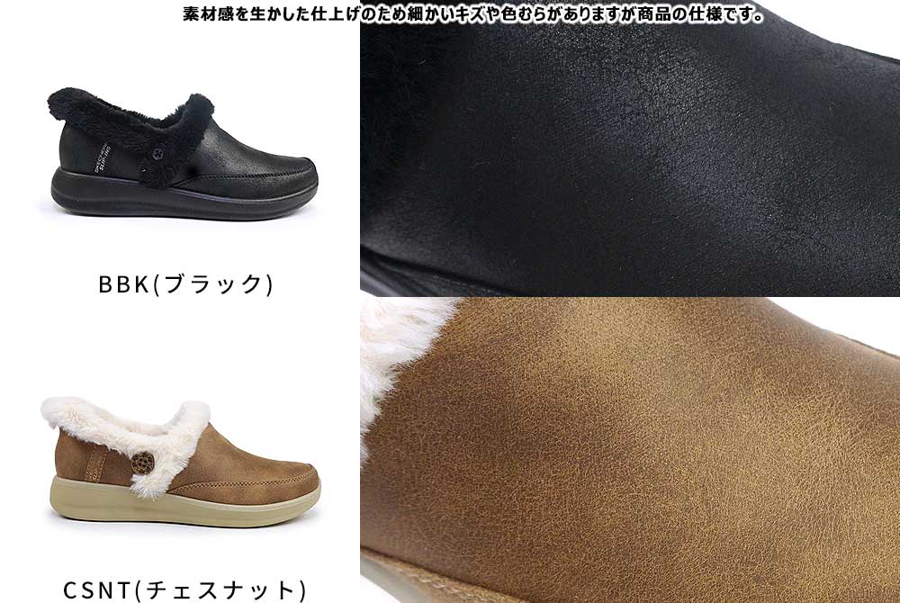 フェイクファーを縁にあしらい、クッション性のあるスケッチャーズ メモリーフォームフットベッドで仕上げました。