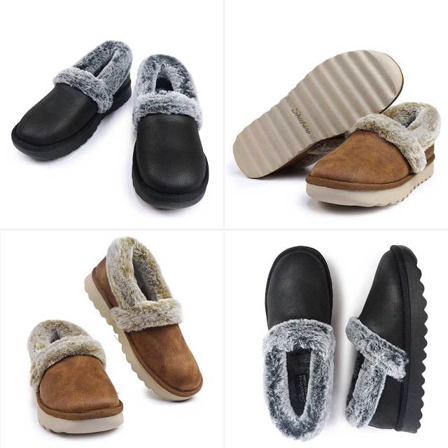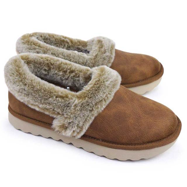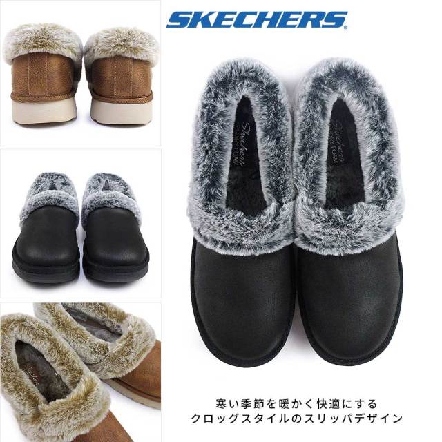 寒い季節を暖かく快適に演出する、スケッチャーズ コージー アップ。人工皮革のアッパー、履き口とライニングにはフェイクファー、