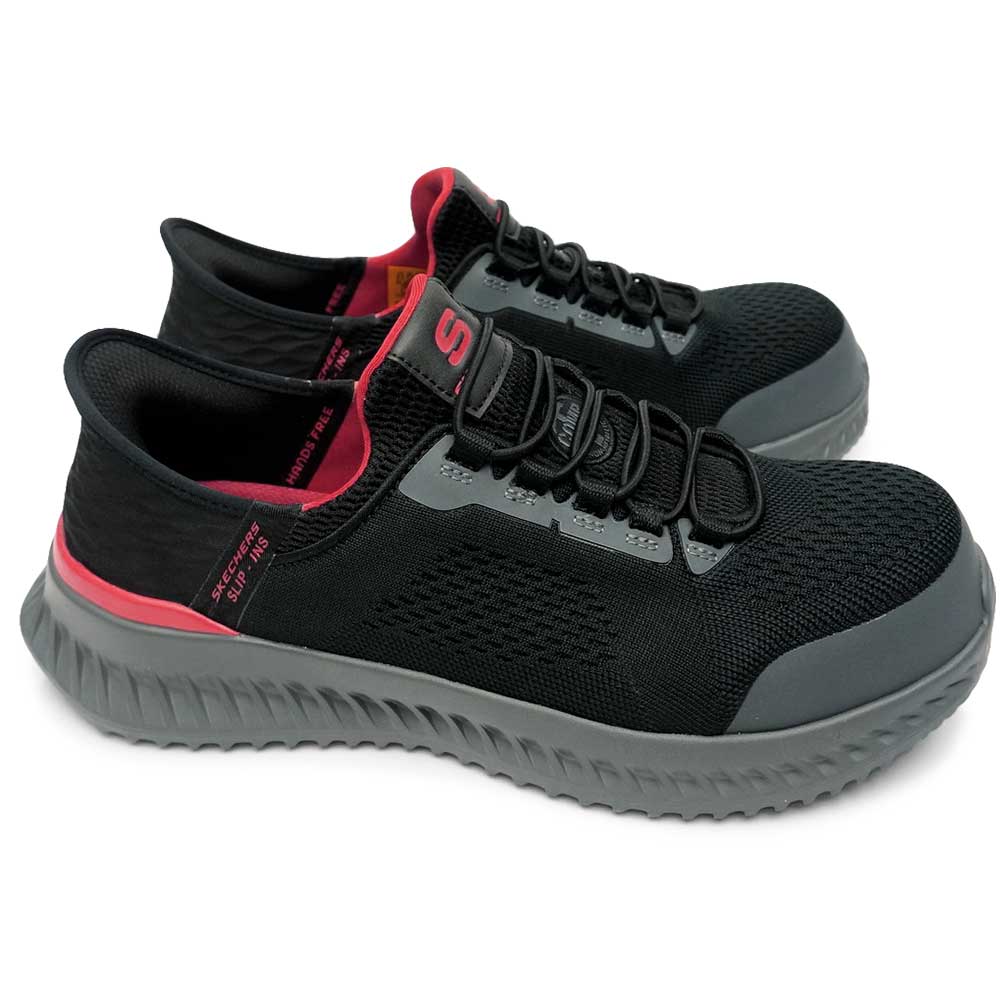 セーフティトーを採用したスリップオンタイプのワークシューズ、ストレッチレースのフロントデザイン