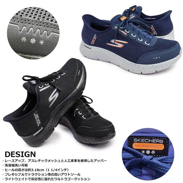 スケッチャーズ独自のエクスクルーシブなヒールピローを採用したこのレースアップは、アスレチックメッシュと人工皮革のアッパーに100%ウォータープルーフの