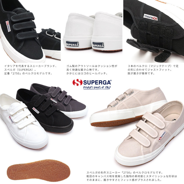 世界中のセレブも愛用する、イタリアの代表的なスニーカーブランド「スペルガ」。スペルガの定番スニーカー【2750】のベルクロ(マジックテープ)モデルです。粗目のキャンバス地を使用した独特の素材感とスタイリッシュな形状はそのままに、履きやすさとフィット感がプラスされました。アッパーに使用されている粗目のキャンバス地は、履きこむほどに味わい深くなる風合いを楽しめます。