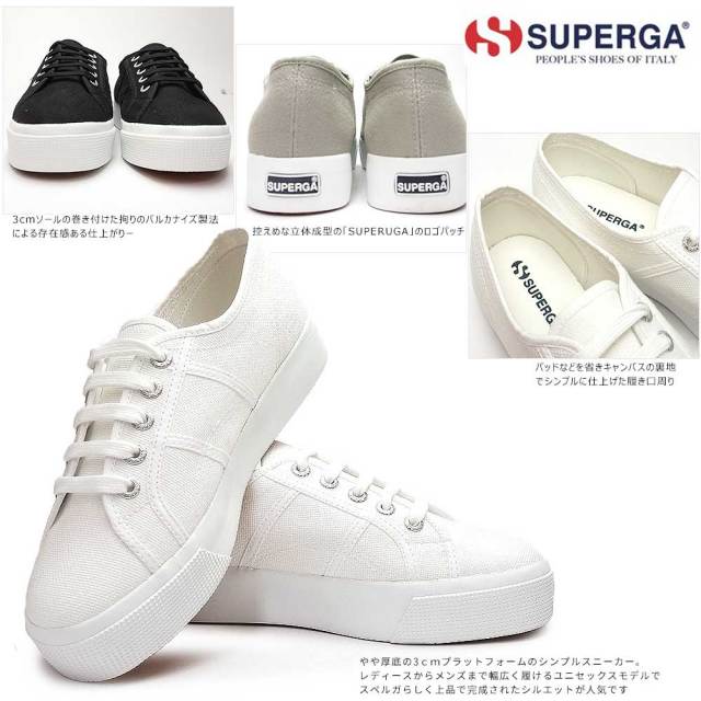 世界中のセレブも愛用する今注目のイタリアンスニーカー、「スペルガ」。上質なキャンバス素材のアッパーで仕上げたやや厚底の3cmプラットフォームソールモデル。上品で仕上がりのシンプルなスニーカーは何にでも合わせやすく男女と問わず履けるモデルです。素足でも心地よく履けるこの春のスニーカーのイチオシのマストアイテム。幅、サイズ感・・・ほぼ標準的な大きさ