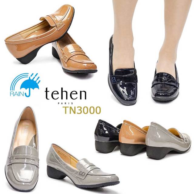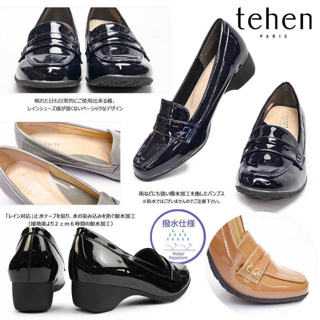 テーン新シリーズ雨の日も安心。「レイン対応」止水テープを貼り、水の染み込みを防ぐ耐水加工(接地面より2cm6時間の耐水加工)、雨などにも強い撥水加工を施したパンプスが新発売。