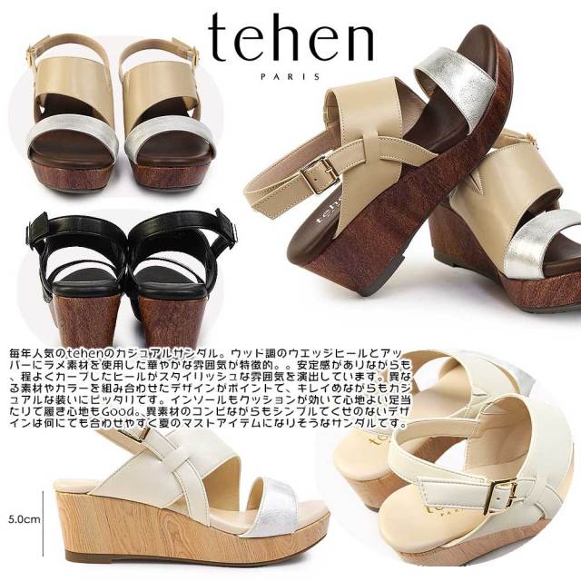 (テーン)は1978年フランス発祥のファッションブランド。毎年人気ののカジュアルサンダル。ウッド調のウエッジヒールとアッパーにラメ素材を使用した華やかな雰囲気が特徴的。。安定感がありながらも、程よくカーブしたヒールがスタイリッシュな雰囲気を演出しています。異なる素材やカラーを組み合わせたデザインがポイントで、キレイめながらもカジュアルな装いにピッタリです。インソールもクッションが効いて心地よい足当たりで履き心地もGood。異素材のコンビながらもシンプルでくせのないデザインは何にでも合わせやすく夏のマストアイテムになりそうなサンダルです。