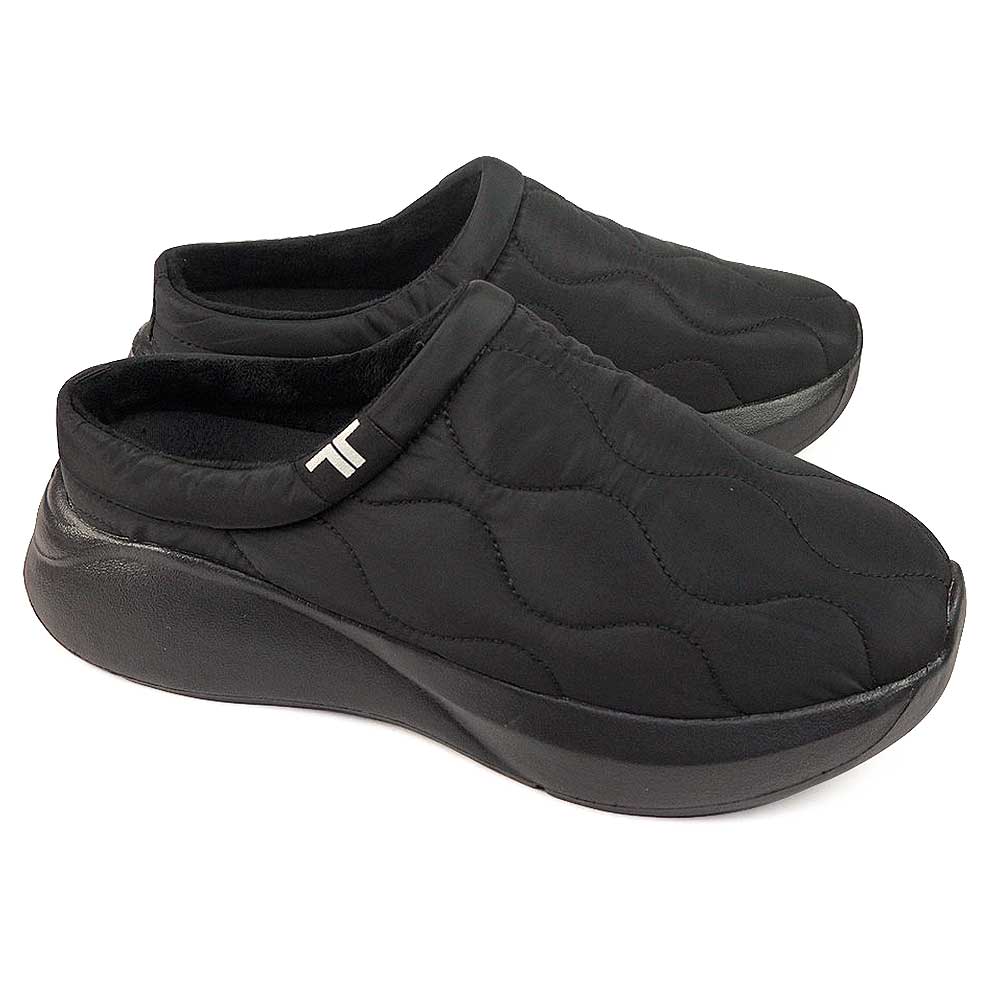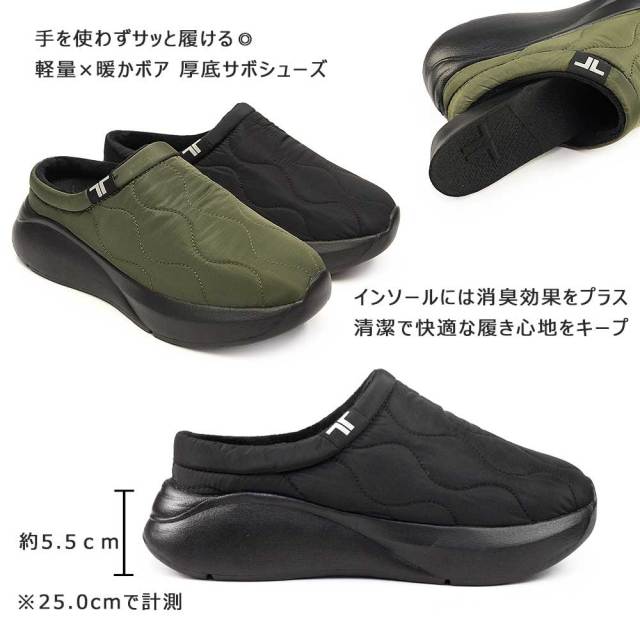 寒い季節の足もとを包み込む、(テリック)の厚底サボ「」。上品な光沢を持つアッパー素材と、ふんわりボアライニングが暖かさをキープ。