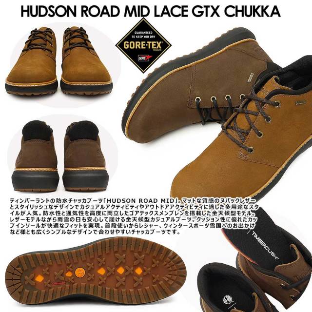 ティンバーランドの防水チャッカブーツ「HUDSON ROAD MID」。マットな質感のヌバックレザーとスタイリッシュなデザインでカジュアルアクティビティやアウトドアアクティビティに適した多用途なスタイルが人気。防水性と通気性を高度に両立したゴアテックスメンブレンを搭載した全天候型モデル。レザーモデルながら雨雪の日も安心して履ける全天候型カジュアルブーツ。クッション性に優れたカップインソールが快適なフィットを実現。ペットボトルからのリサイクル素材を使用し環境にも配慮しています。普段使いからレジャー、ウィンタースポーツ雪国へのお出かけなど様とも広くシンプルなデザインで合わせやすいチャッカブーツです。※部分的に白っぽくなっていたり擦れ、色ムラ、細かい傷等がありますが商品の仕様です。
