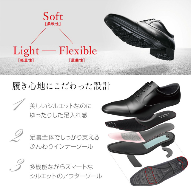 軽やかな歩き心地はそのままに、ラグジュアリーなテクシーリュクス。本革ビジネスシューズなのにスニーカーのような履き心地を実現。光沢ソフト牛革とフォルムを追求したドレッシー&スマートなデザイン。履き口に小さなゴア(ゴム)入で着脱も容易。