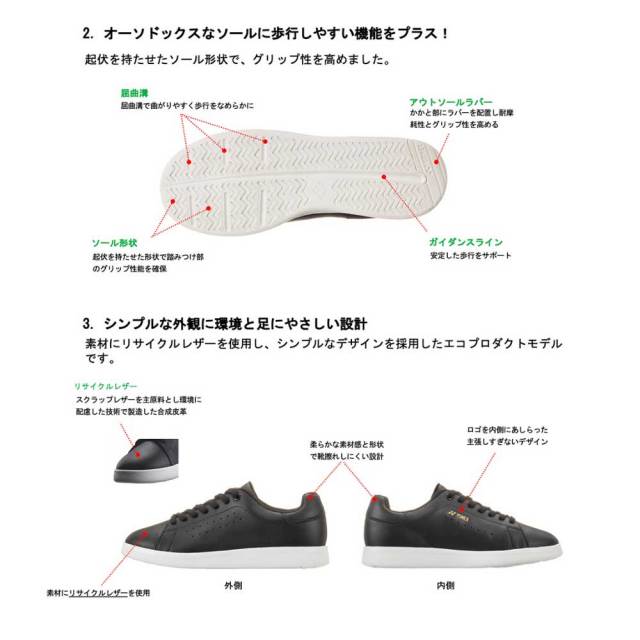 素材:アッパー:リサイクルレザー(合成皮革)、抗菌防臭加工ライニング
