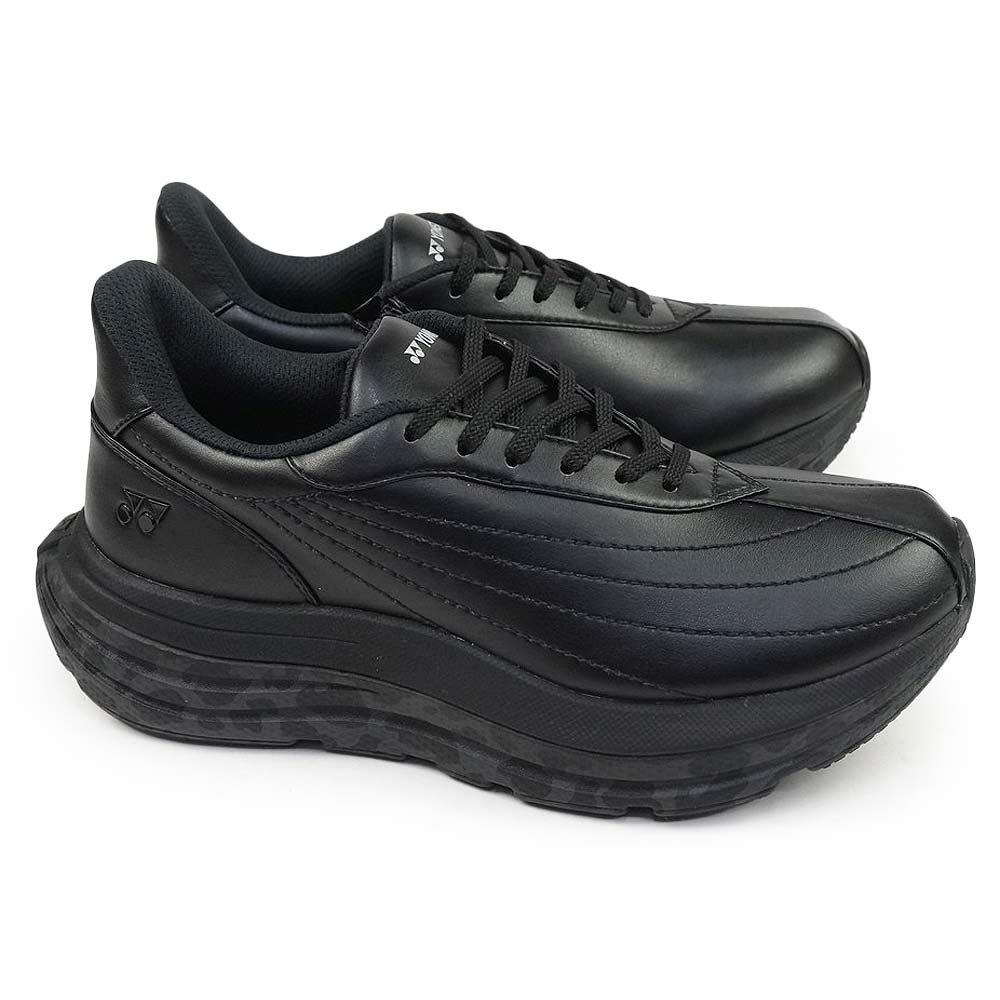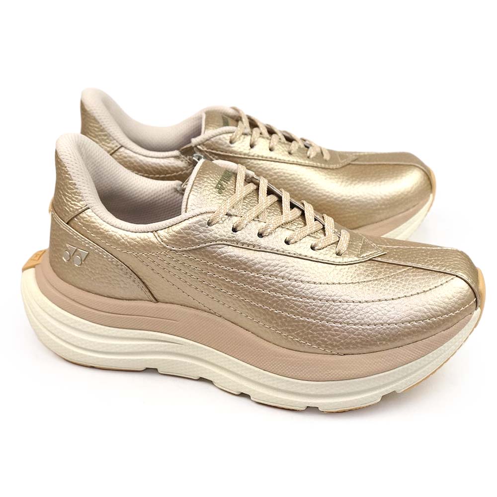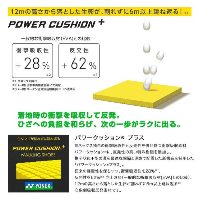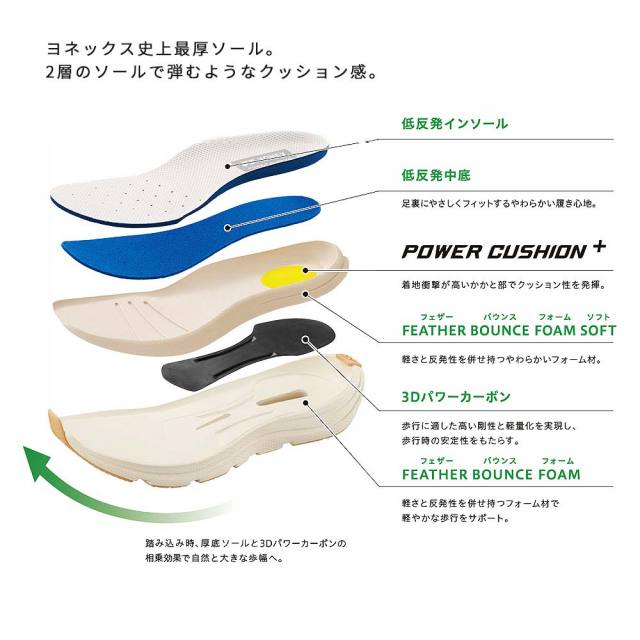 低反発と高反発で衝撃を吸収しひざにやさしい、ヨネックスが独自に開発した軽量衝撃吸収材パワークッションプラスを搭載したフェザーバウンスフォームソフトとフェザーバウンスフォームの2層ソールではずむような歩行感をもたらす、厚底タイプのシューズ。「Auto Spont(オートスポント)」機能で手を使わずにラクに履け、甲のファスナーと併用、またかかと部のフットボードを踏むことでハンズフリーで脱ぎ履きがしやすいデザインです。幅、サイズ感・・・3.5E